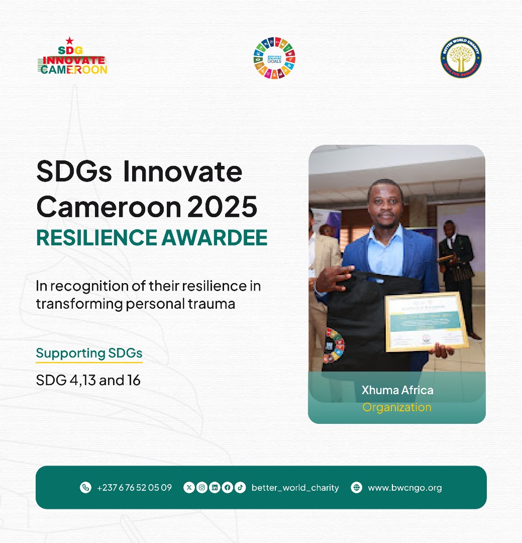 Xhuma Africa Association captivated SDG Innovate Cameroon 2025, hosted by Better World Charity on September 23, 2025, in Yaoundé. Founded by Nduku Louis Tebi, who survived kidnapping during the Anglophone conflict, Xhuma Africa transforms trauma into empowerment through its "Peace Weavers" program in Bamenda. By training young survivors to combat hate speech, gun violence, and environmental degradation, they advance SDG 16 (Peace, Justice, and Strong Institutions), SDG 4 (Quality Education), and SDG 13 (Climate Action). Despite conflict and limited resources, their community-driven approach inspires a resilient, equitable Cameroon.