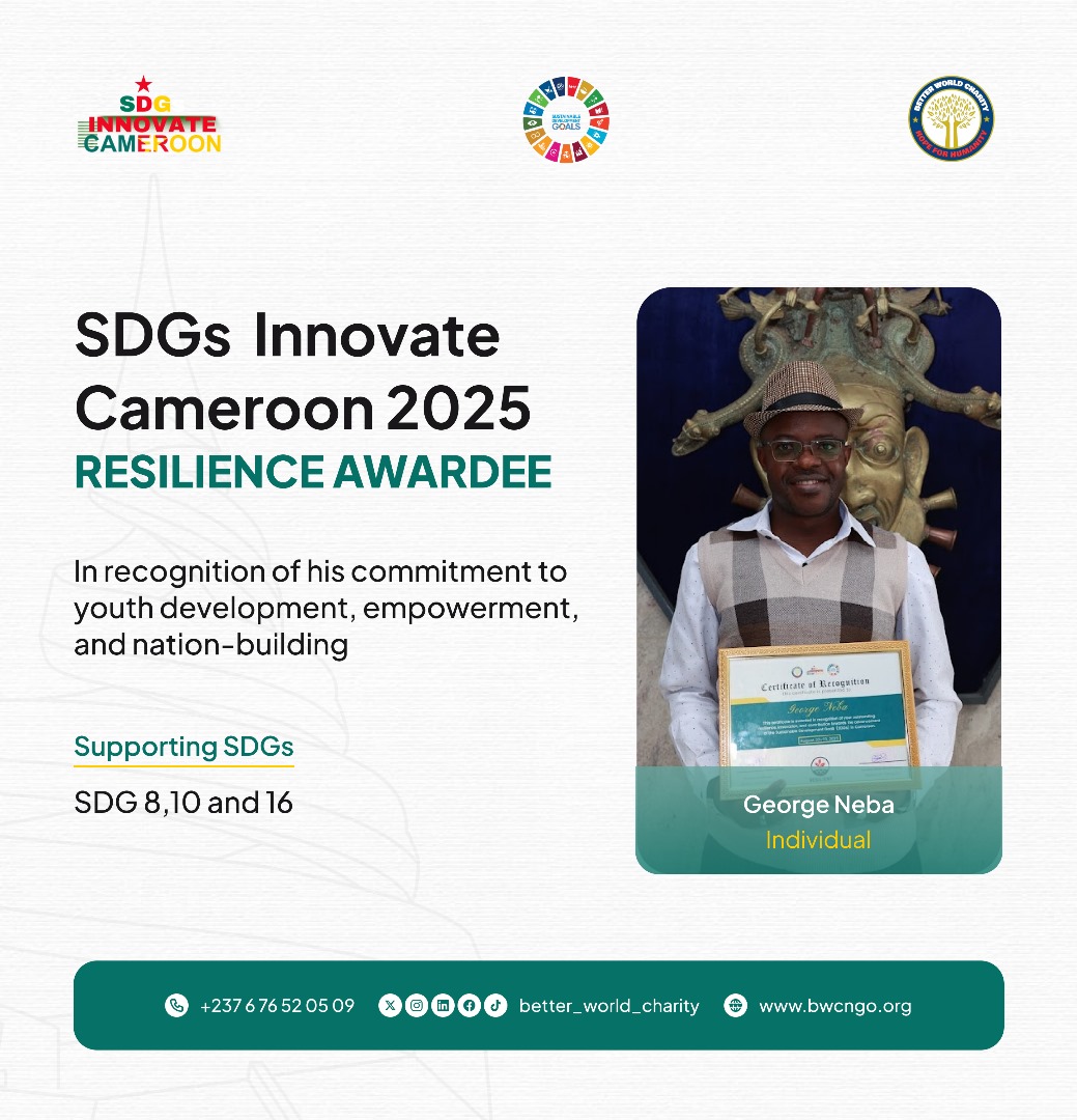 George Neba’s dedication shone at SDG Innovate Cameroon 2025, hosted by Better World Charity on September 23, 2025, in Yaoundé, earning him a Community Impact Award nomination. Through initiatives like the Youth Development Fellowship, NEWOLEC Mentorship for Young Girls, and Digital Literacy for Grassroots Women, he empowers youth and women, advancing SDG 4 (Quality Education), SDG 5 (Gender Equality), and SDG 16 (Peace, Justice, and Strong Institutions). His work in the REPAIR Convention and “Who Wants to be an Agripreneur?” fosters sustainable livelihoods, inspiring a resilient, equitable Cameroon